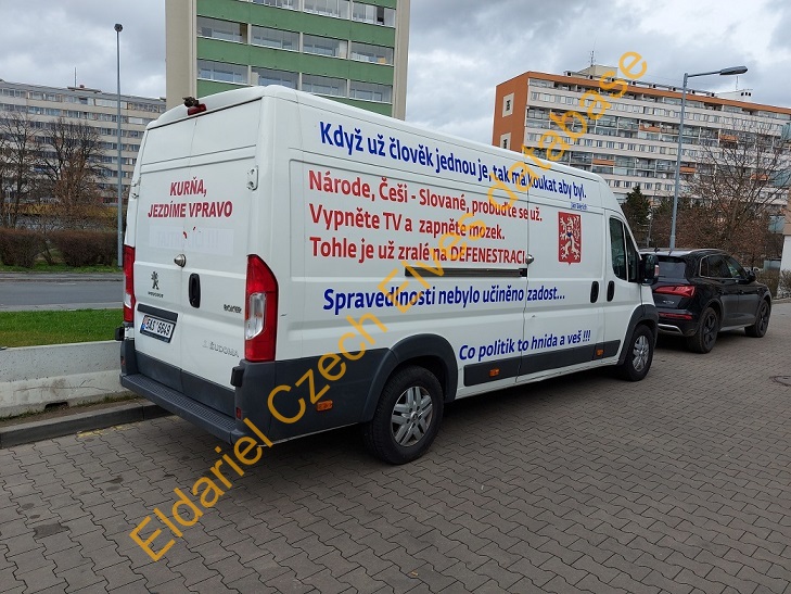 Dodávka s národ burcujícím, skoro až fašistickým nápisem na boku.