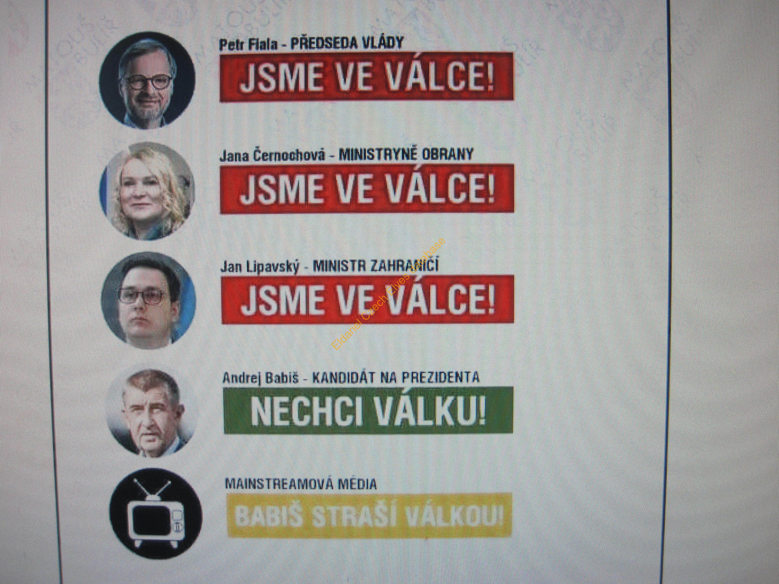 Fotografie, gde jediný Andrej Babiš nechce válku politici z pětioalice říkají že jsme ve válce, manistramová media lžou a říkají, že Babiš straší válkou