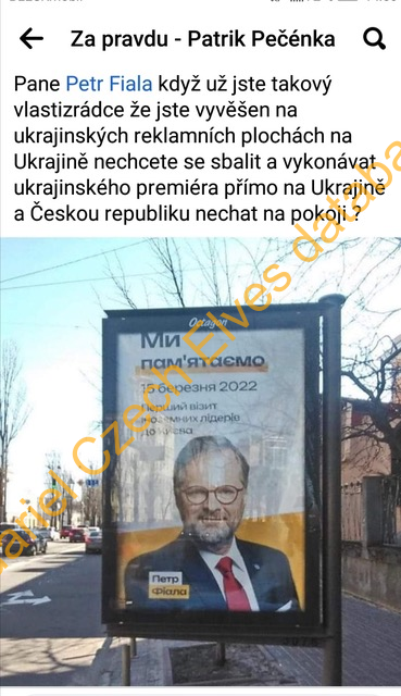 Nařčení premiéra Petra Fialy z vlastizrady a výzva k odchodu na Ukrajinu, tentokrát kvůli billboardům v Kyjevě, které jsou poděkováním západním lídrům za podporu Ukrajiny návštěvou Kyjeva 15. března 2022.