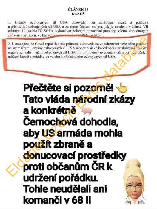Přečtěte si pozorně! Tato vláda národní skázy a konkrétně Černochová dohodla, aby US armáda mohla použít zbraně a donucovací prostředky proti občanům ČR k udržení pořádku. Tohle neudělali ani Komsnči v 68!!