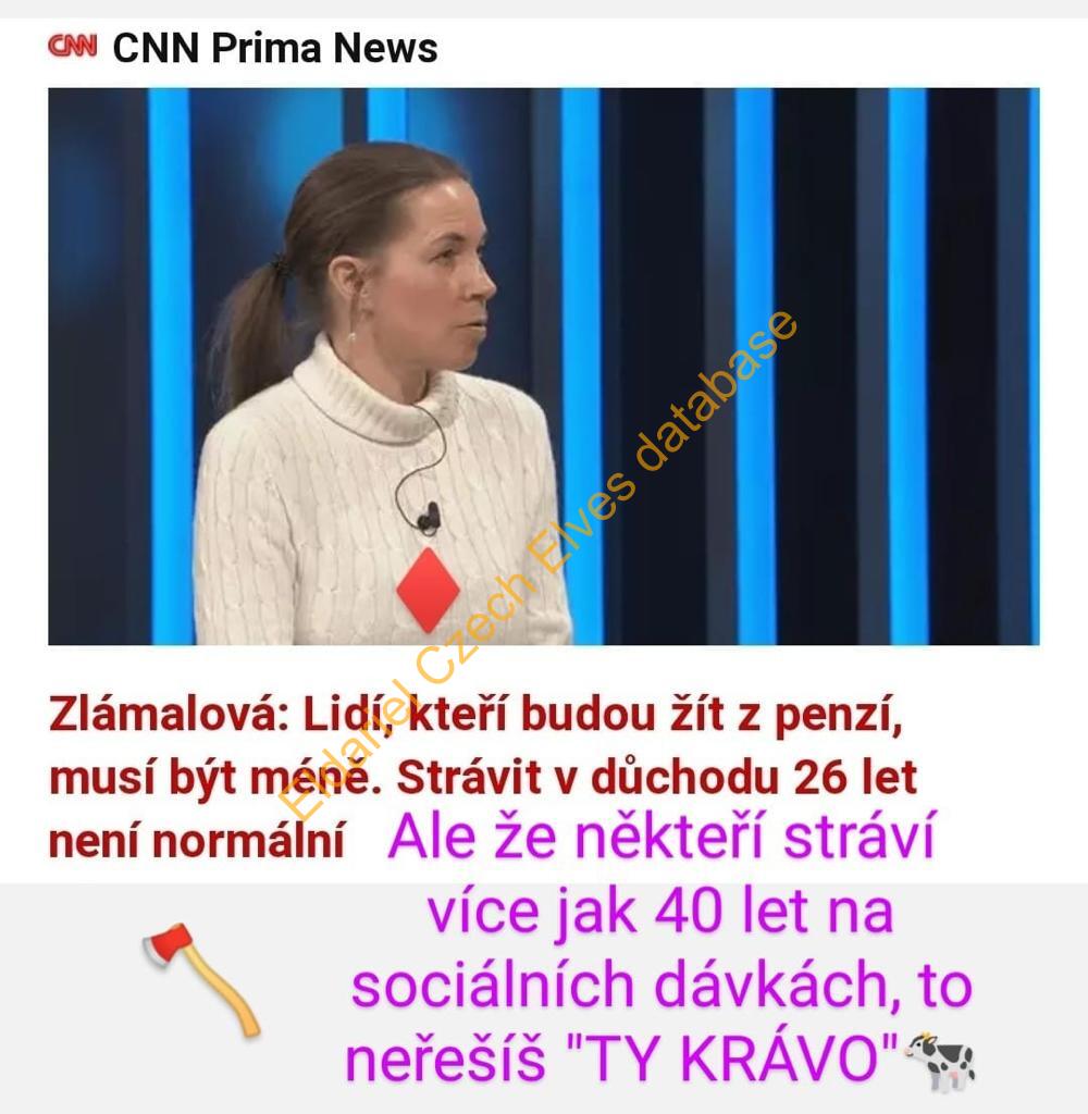 Obrázkový mem, citující Lenku Zlámalovou z rozhovoru na CNN Prima News, kde říká, že není normální pobírat důchod 26 let, ale to, že je někdo 40 let na sociálních dávkách, neřeší.