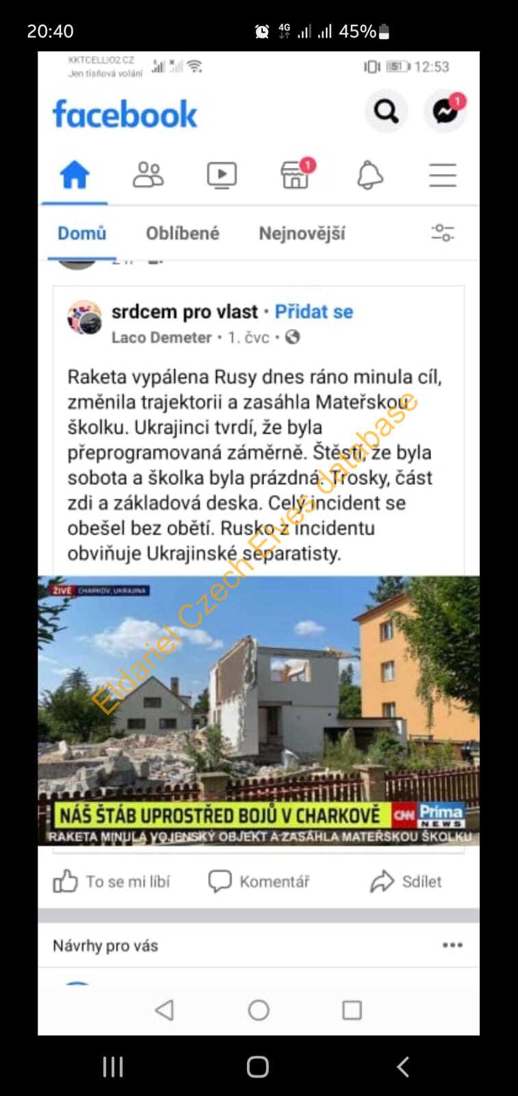 Pozorně se podívejte a přečtěte si text přiložené zprávy z Prima CCN: "Náš štáb uprostřed bojů v Charkově. Raketa minula vojenský objekt a zasáhla mateřskou školku" A obrázek zničené budovy "mateřské školky". To je ten hanebný ruský teror proti civilnímu obyvatelstvu na Ukrajině!!! Skutečnost je ovšem poněkud jiná. Přiložený obrázek zobrazuje demolici rodinného domku čp. 639 v Dobrušce (pan Petr), ""v sousedství dobrušského Kina 70. Takže až zase někdo vás bude přesvědčovat o ruských dezinformačních kampaních, tak si na tenhle obrázek vzpomeňte. Dezinformace skutečně probíhají. Ovšem jak je vidět, na obou stranách. Na stránkách CCN to nehledejte, už to dávno stáhli. P.S. :-((:-((:-(( Ale že se k tomu přidávají i naše "nezávislá" media, to je poněkud na pováženou. " Mohu potvrdit, toto místo důvěrně znám, neboť je kousek od domu kde bydlel bratr Honza - směrem k bývalým kasárnám...