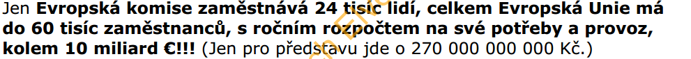 PS: Mimochodem: stejnou otázku si můžeme klást v menším rozměru v naší zemi. Nač (a za kolik peněz) si platíme ten obrovský perzekuční a diktá- "torský byrokratický aparát, naprosto nesmyslně přebujelou vládu, stejně tak" přebujelý počet ministerstev a absurdně obrovský počet zaměstnanců každého "ministerstva, nač potřebujeme dvě komory parlamentu s 271 členy, z nichž každý" "má kromě svých platů množství náhrad za výdaje, které si normální lidé platí" "přímo, též suity poradců a podržtažků a asistentů. A mohli bychom pokračovat" "dále. Stát, stejně jako EU, je zbytnělý, centralistický, byrokratický moloch, který" parazituje na životech lidí. Jiný účel nemá!