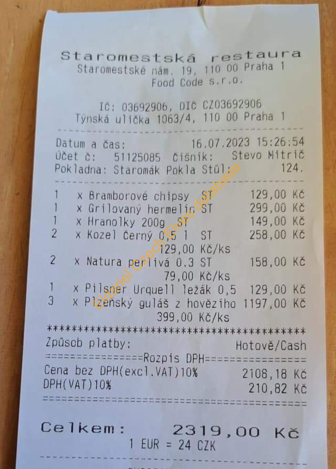 | 25964 | Účtenka ze staroměstské restaurace v Praze 1 ze dne 16.07.2023.....to jsou teda lidové ceny !!!!!!! | 2023-10-06 08:35:29 |