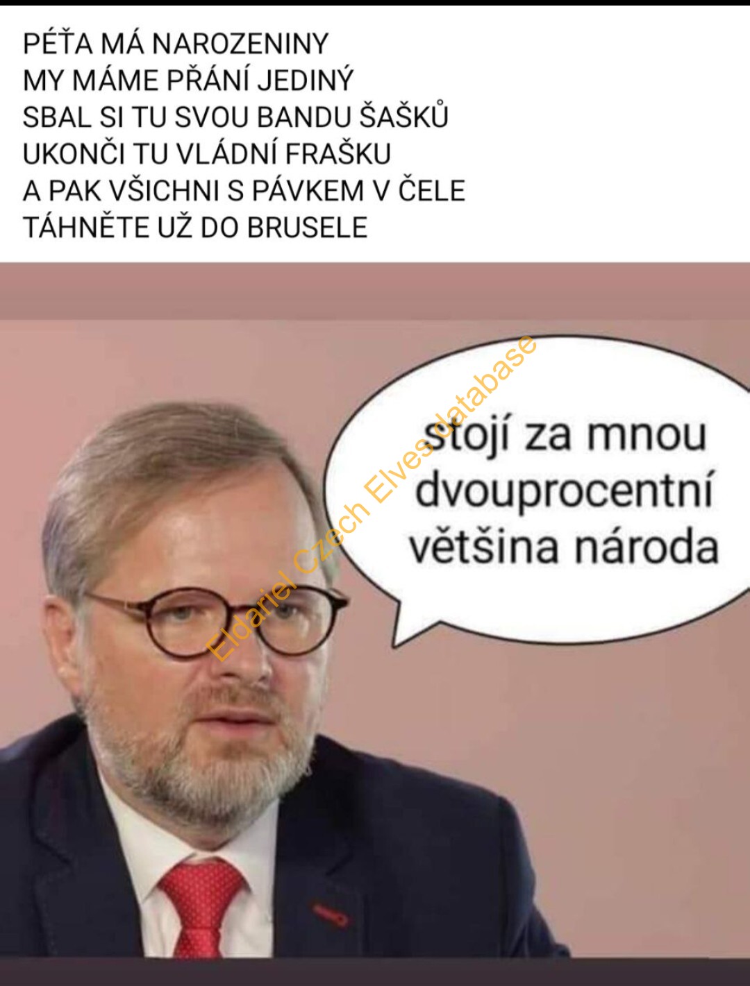 5) Péťa má narozeniny my máme přání jediný sbal si tu svou bandu šašků ukonči tu vládní frašku a pak všichni s Pávkem v čele táhněte už do Bruselu. stojí za mnou dvouprocentní většina národa.