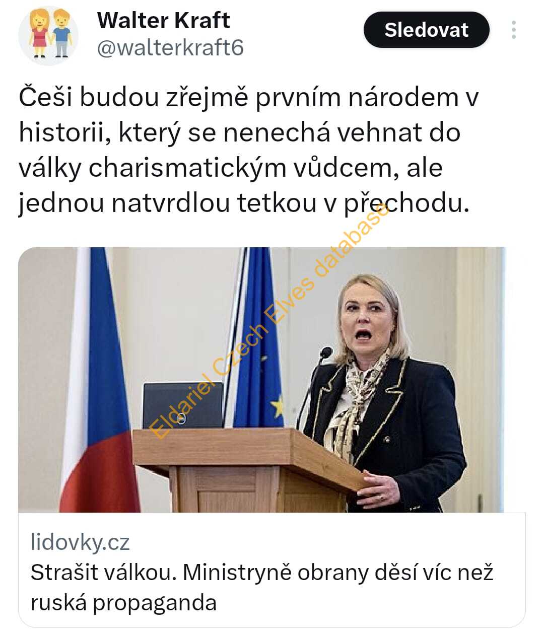 6) Walter Kraft Češi budou zřejmě prvním národem v historii, který se nenechá vehnat do války charismatickým vůdcem, ale jednou natvrdlou tetkou v přechodu. Strašit válkou. Ministryně obrany děsí víc než ruská propaganda.