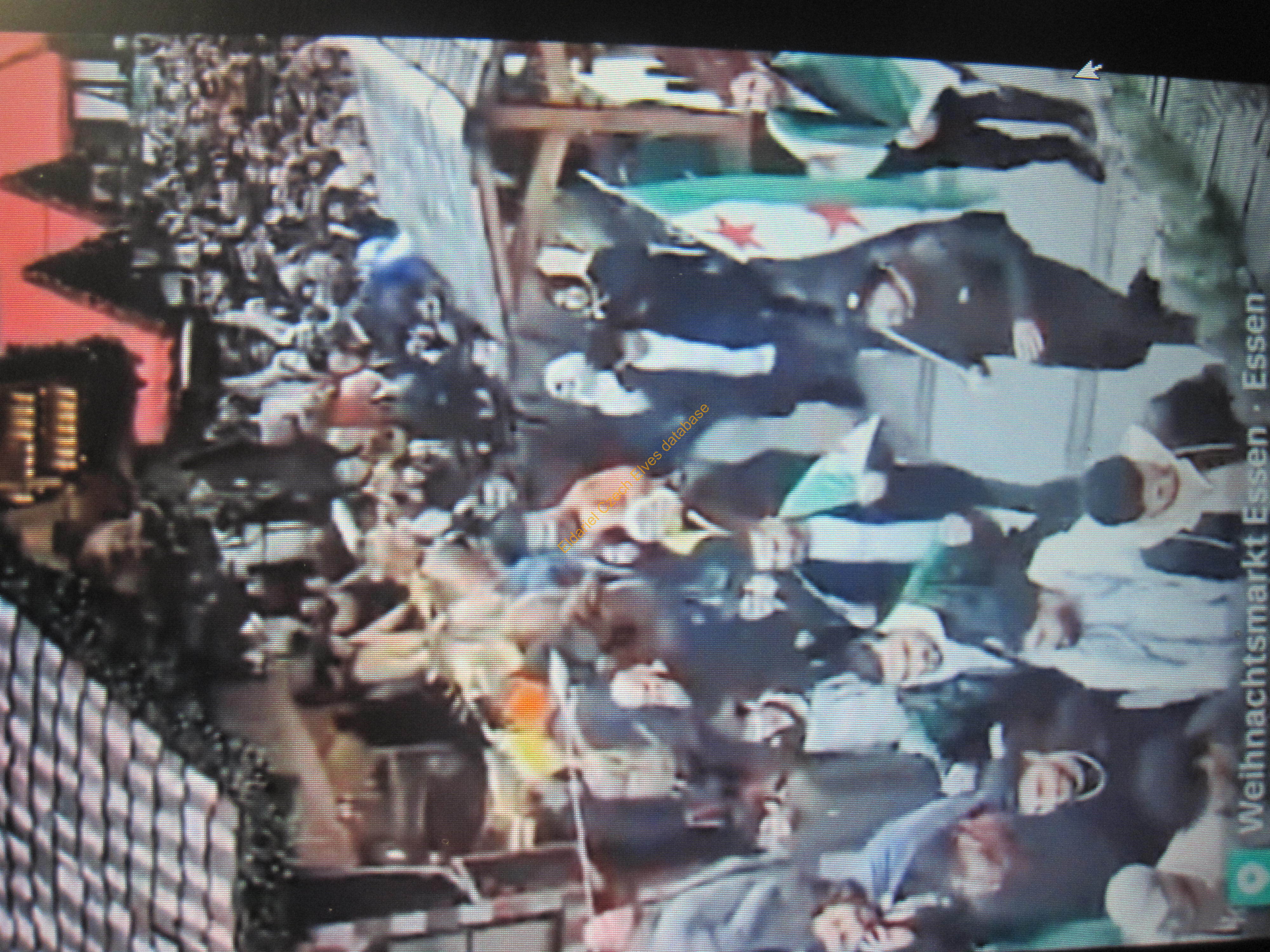 Obrázek ukazuje scénu na vánočním trhu v německém městě Essen. Vidíme dav lidí, přičemž několik osob nese vlajky se třemi červenými hvězdami na zeleno-bílo-černém pozadí, což odpovídá vlajce Svobodné syrské armády (FSA), používané opozicí v Sýrii. Zdá se, že se jedná o průvod nebo demonstraci syrské komunity na trhu. Vlevo lze vidět typickou výzdobu vánočních trhů, například dřevěné stánky a osvětlení. Celková kvalita obrázku je nízká, což ztěžuje rozpoznání detailů.