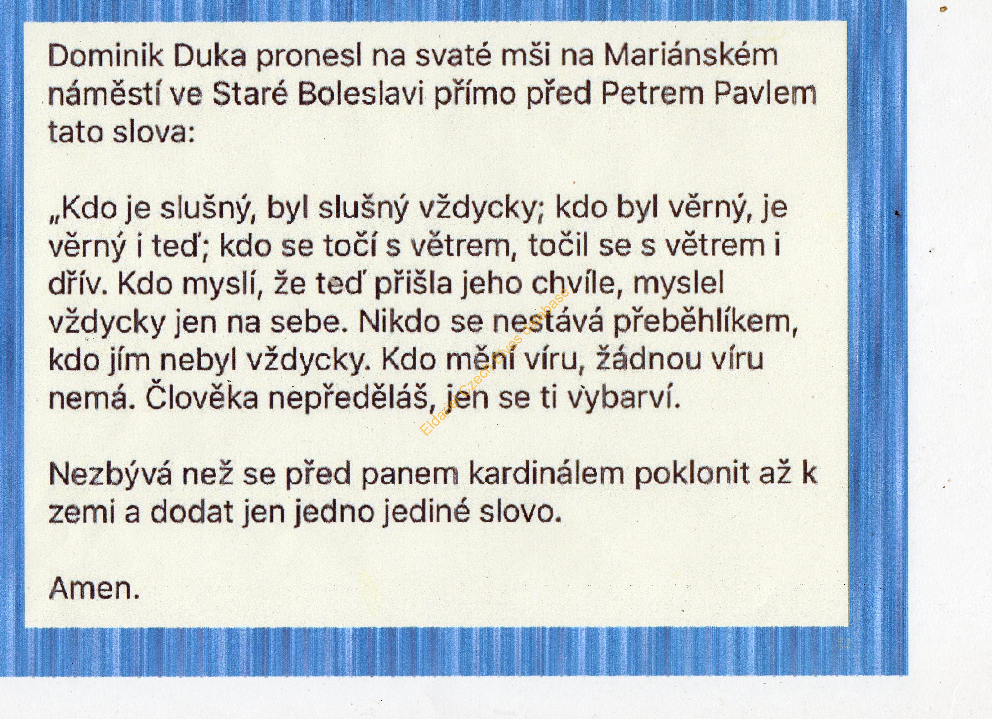 Během bohoslužby, konané dne 28. 9. 2023 na Mariánském náměstí ve Staré Boleslavi, pronesl emeritní pražský arcibiskup kardinál Dominik Duka před prezidentem Petrem Pavlem slova o věrnosti a stálosti. Autor se domnívá, že tato slova byla určena přímo prezidentovi.