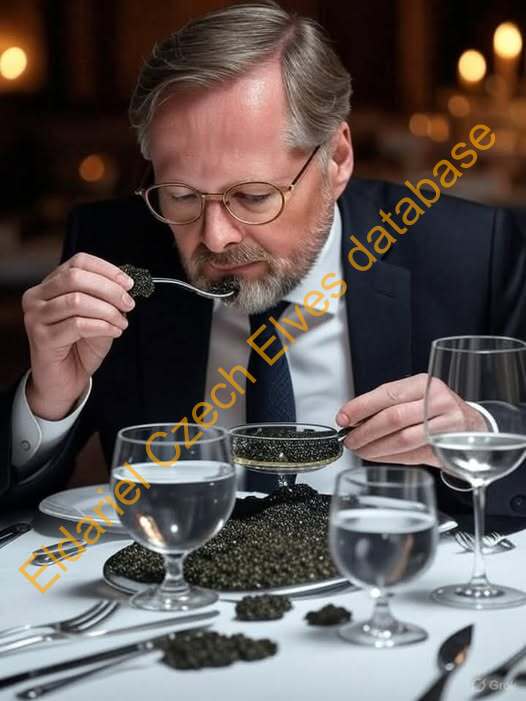 DEEPFAKE fotografie Petra Fialy s kaviárem. Text ukazuje na to, že ministři projedli stovky milionů se zahraničními delegacemi.