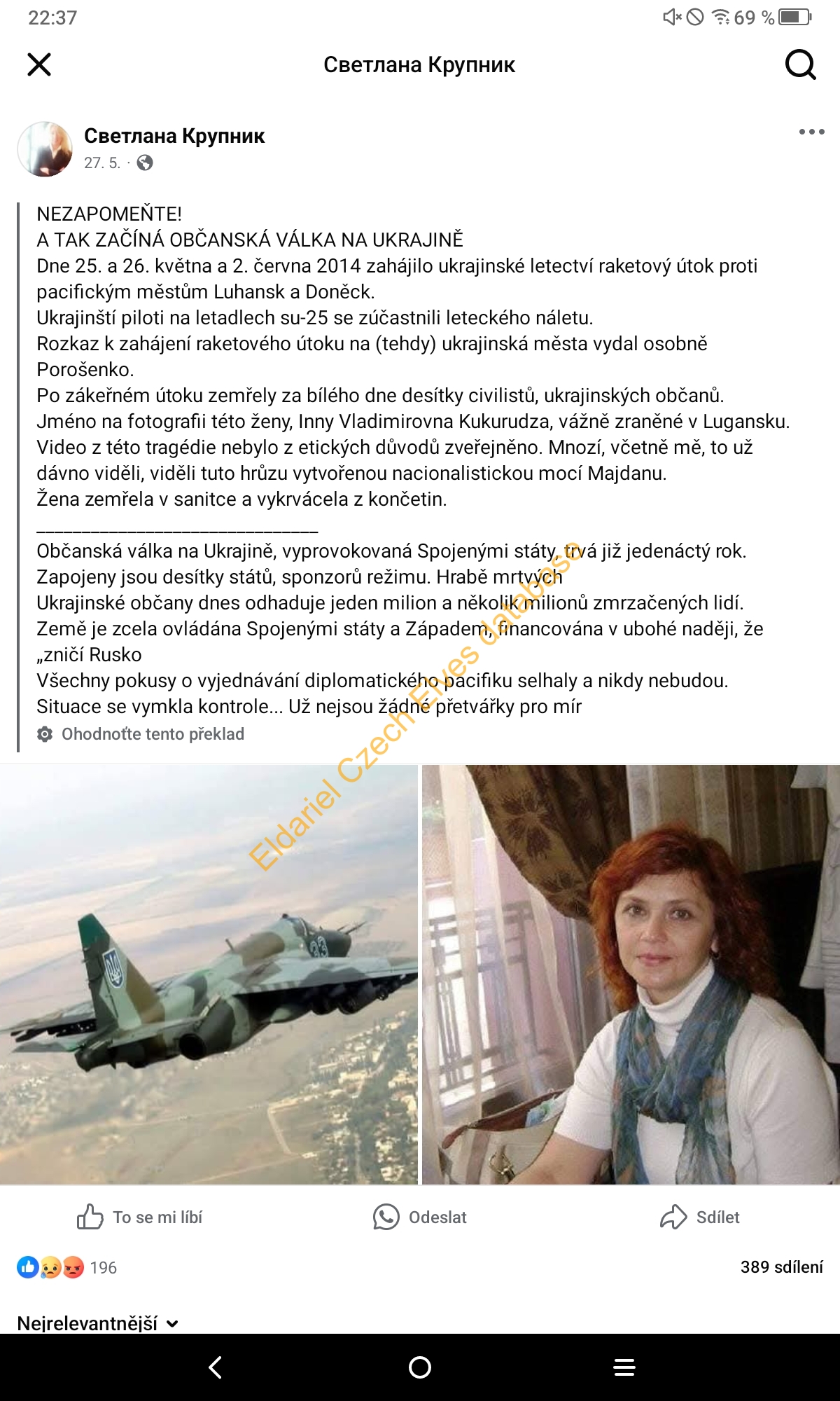 Facebookový příspěvek obviňující Ukrajinu z toho, že v roce 2014 začala občanskou válku, když provedla raketový útok proti městům Doněck a Luhansk, při kterém zemřely desítky civilistů. Text obviňuje USA a Západ z toho, že zcela ovládly Ukrajinu a využili ji ve snaze ke zničení Ruska.