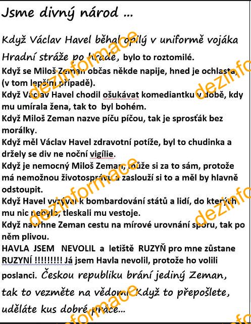 text obrázku v příloze srovnává V. Havla a Zemana (Havel stejný jako Zeman, ale co se na Havlovi líbilo se na Zemanovi nelíbí), jde o hoax viz https://manipulatori.cz/hoax-kdyz-vaclav-havel-behal-opily-v-uniforme-vojaka-hradni-straze-po-hrade/