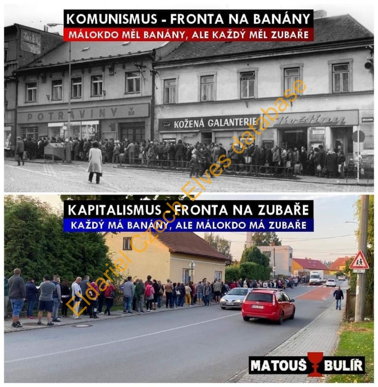 kompilace 2x foto - údajný autor Matouš Bulíř - 2x fronta lidí - "komunismus - fronta na banány; málokdo měl banány, ale každý měl zubaře" - "kapitalismus - fronta na zubaře; každý má banány, ale málokdo má zubaře".