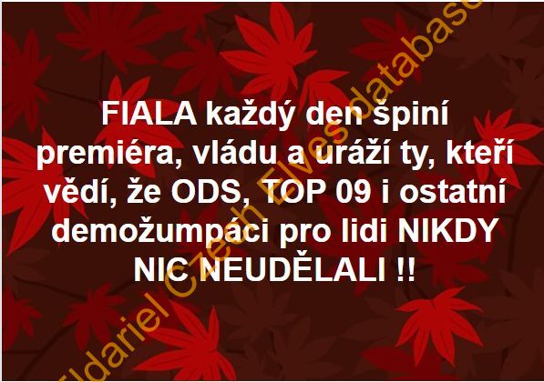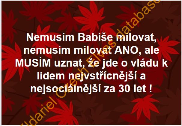 Obrázky 18x typu MEM (ovšem každý je tam 2x) - adorace Babiše a jeho vlády, napadání představitelů TOP 09 (Feri, Pekarová Adamová, Schwarzenberg, Kalousek), ODS (Fiala) + ministra zahraničí za ČSSD Petříčka a neziskové organizace. Brání vládu před kritikou za opatření proti Covid-19.
