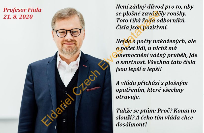 Obrázek Petra Fialy s údajným jeho citátem z 21.8.2020, že není třeba se bát pandemie covid-19 a nosit roušky