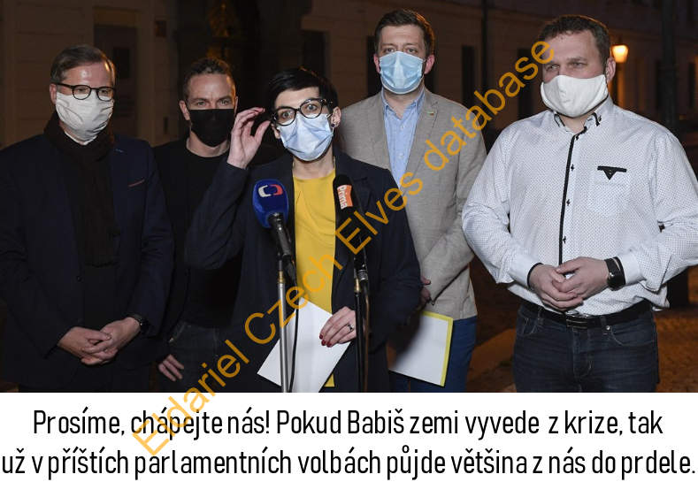- .png obrázek bez dohledatelného zdroje; zachycující leadery opozice, dole doprovozený nápisem, že pokud Babiš vyvede zemi z krize, oni půjdou v příštích volbách do prdele.