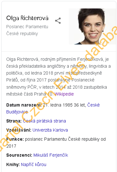 Hanopis na Olgu Richterovou a Piráty obsahující vymyšlený výrok Olgy Richterové o imigrantech, snímek jejího profilu na wikipedii a její fotky.