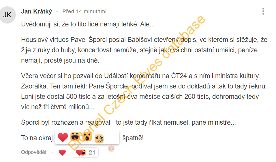 Včera večer si ho pozvali do Událostí komentářů na ČT24 a s ním i ministra kultury Zaorálka. Ten tam řekl: Pane Šporcle, podíval jsem se do dokladů a tak to tady řeknu. Loni jste dostal 500 tisíc a za letošní dva měsíce dalších 260 tisíc, dohromady tedy víc než tři čtvrtě milionů...